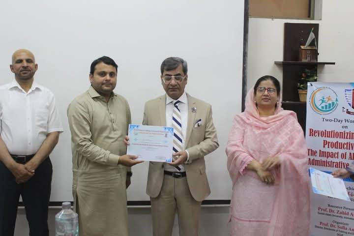 The workshop featured Prof. Dr. Zahid Asghar, Professor of Economics at Quaid-i-Azam University, Islamabad, as the lead resource person. Dr. Asghar, an acclaimed expert in economics, data science, and digital transformation, provided hands-on training and insightful lectures on the practical applications of Artificial Intelligence in administrative settings. His sessions covered a variety of AI-powered tools, including intelligent document editors, automated scheduling assistants, advanced email management systems, and smart data organization platforms.