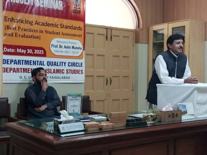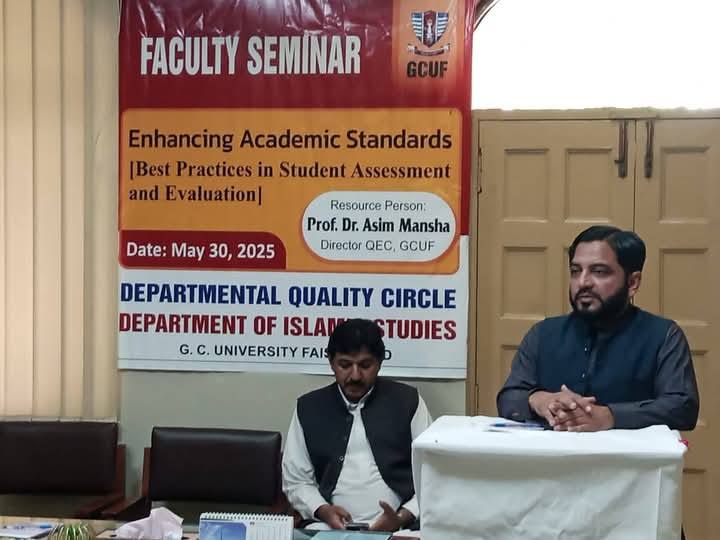 Under its Departmental Quality Circle, the Department of Islamic Studies, Government College University Faisalabad, organized a faculty seminar titled Enhancing Academic Standards: Best Practices in Student Assessment and Evaluation. The esteemed resource person for the session was Prof. Dr. Asim Mansha, Director of the Quality Enhancement Cell (QEC), GCUF.