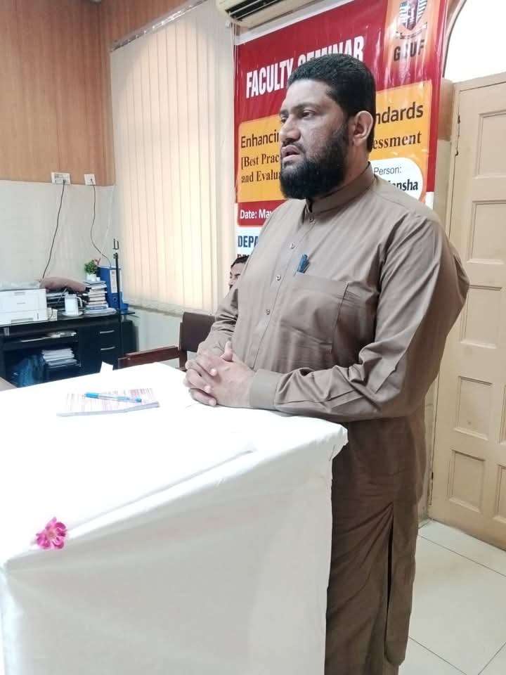 The Seminar commenced with a welcome note by Dr. Yasir Arfat, Chairman, Department of Islamic Studies. In his address, Dr. Arfat warmly welcomed the resource person and highlighted the objectives and significance of the seminar. He emphasized that, under the dynamic leadership of the Vice Chancellor, the university is committed to achieving academic excellence. He noted that this seminar is part of the broader vision to align GCUF’s academic practices with those of top-ranked educational institutions.
