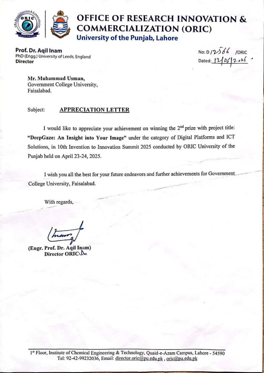 Letter of appreciation and cash prize of 25,000 from ORIC, University of Punjab Lahore to Mr. Muhammad Usman, Lecturer of Computer Science, GCUF, on achieving 2nd Position at the prestigious 10th Invention to Innovation Summit 2025, organized by University of the Punjab, Lahore.