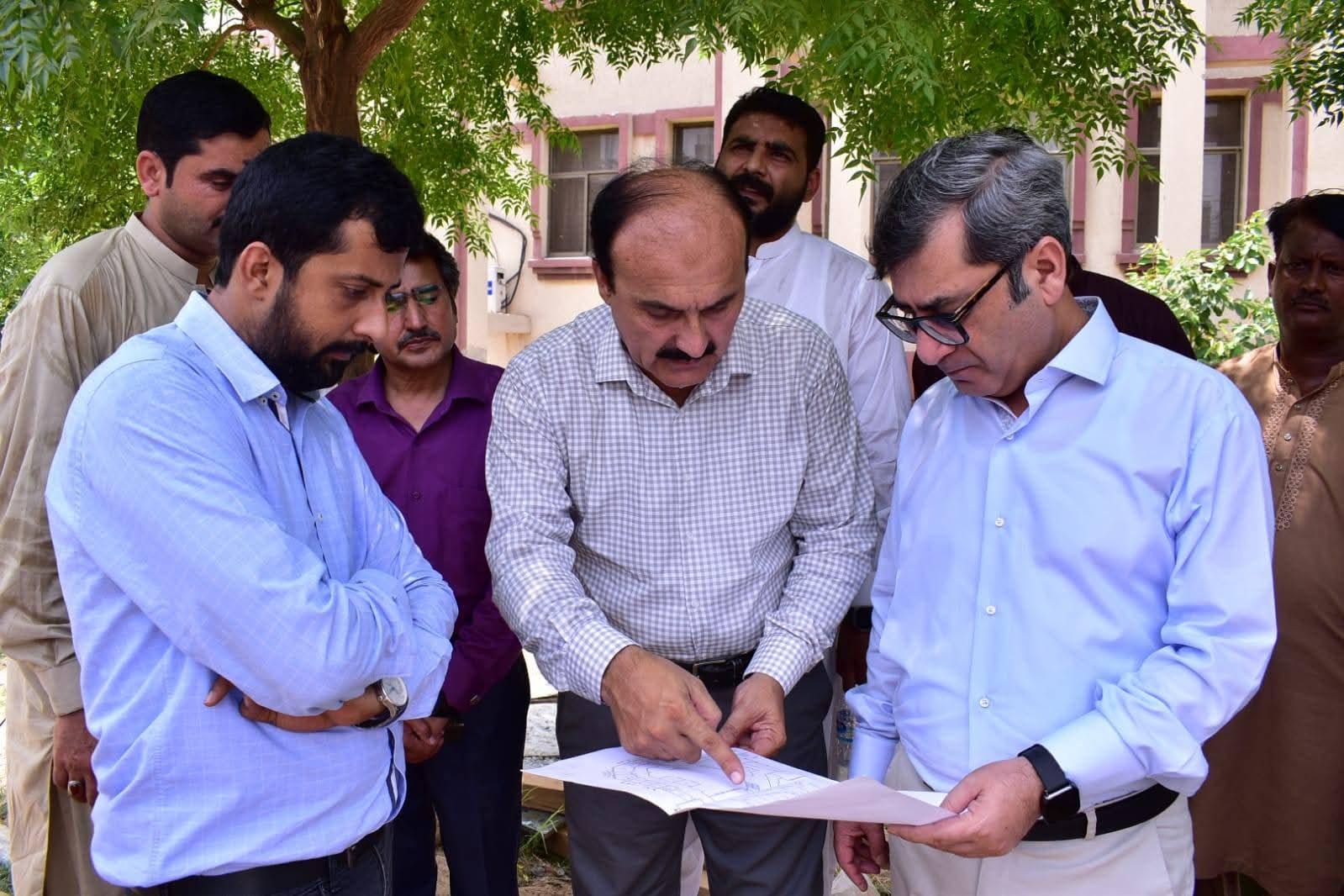 Vice Chancellor of Government College University Faisalabad, Professor Dr. Rauf Azam, visited various ongoing development projects at the New Campus and conducted a detailed inspection of the construction activities. He was accompanied by Director Planning and Development Professor Dr. Muhammad Iqbal, Project Director Engineer Ibrahim Khan, and Chairman Estate Care Professor Dr. Naeem Iqbal.