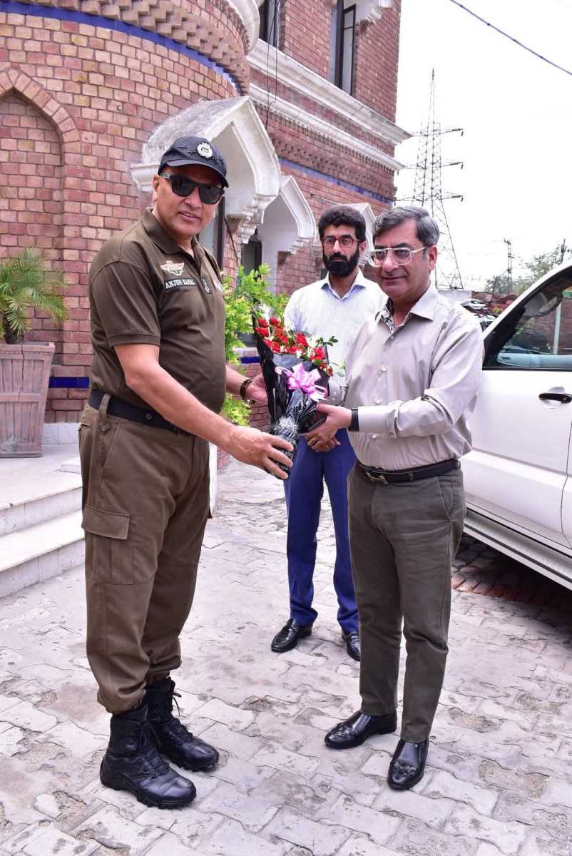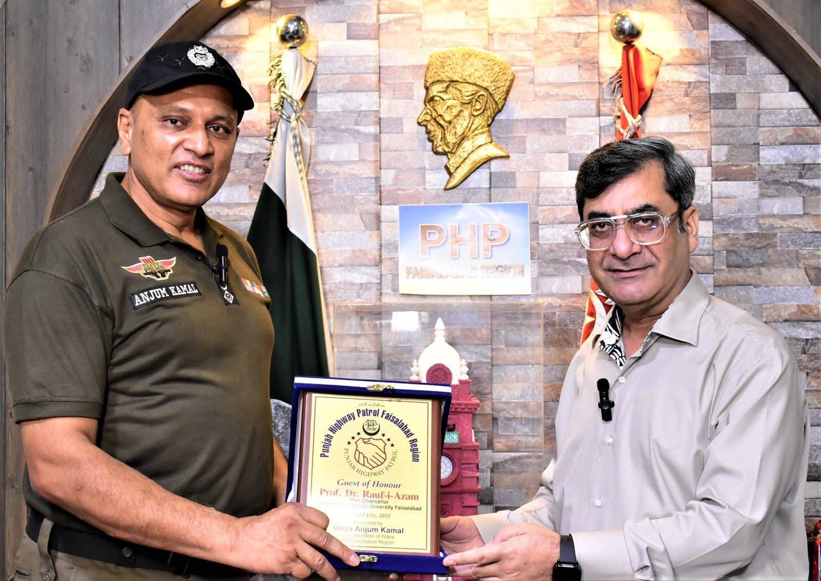 Government College University Faisalabad and Punjab Highway Patrol Police have reached a consensus to launch a joint awareness campaign aimed at educating students about traffic rules and regulations. In this regard, GCUF Vice Chancellor Professor Dr. Rauf-i-Azam visited the Faisalabad headquarters of the Patrolling Police, where he was warmly received by SSP Mirza Anjum Kamal.