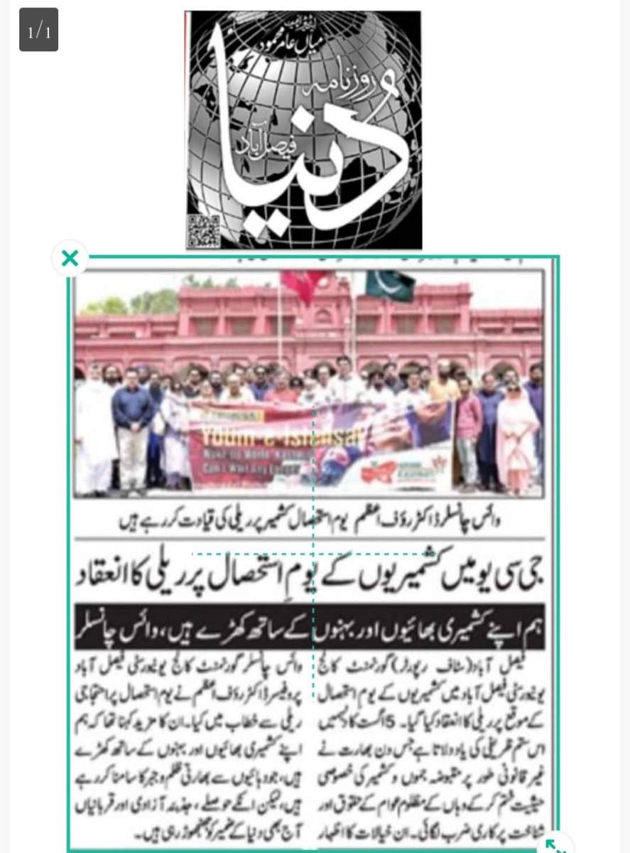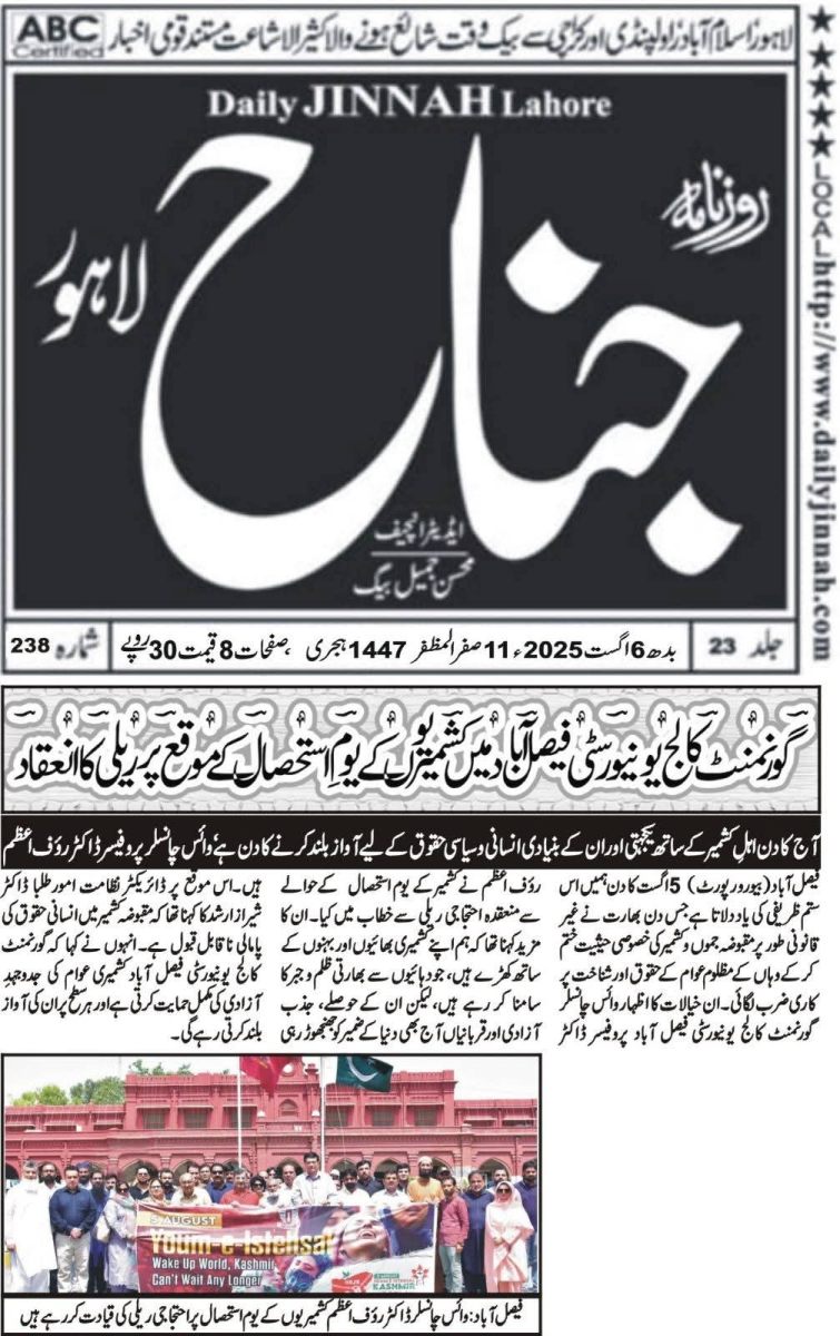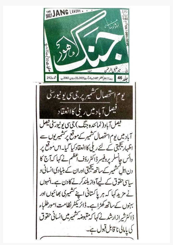 Government College University Faisalabad organized a rally on the occasion of Kashmiris’ Youm-e-Istehsal (Day of Exploitation)