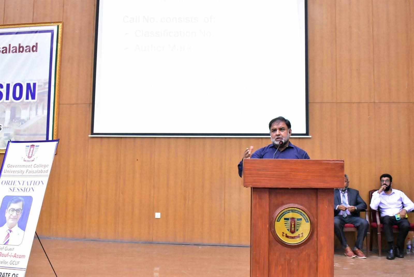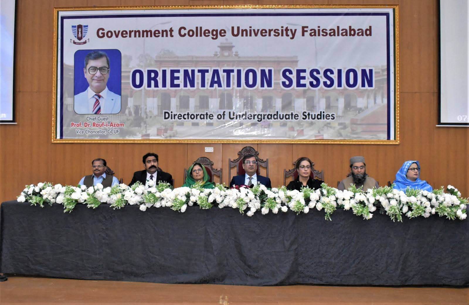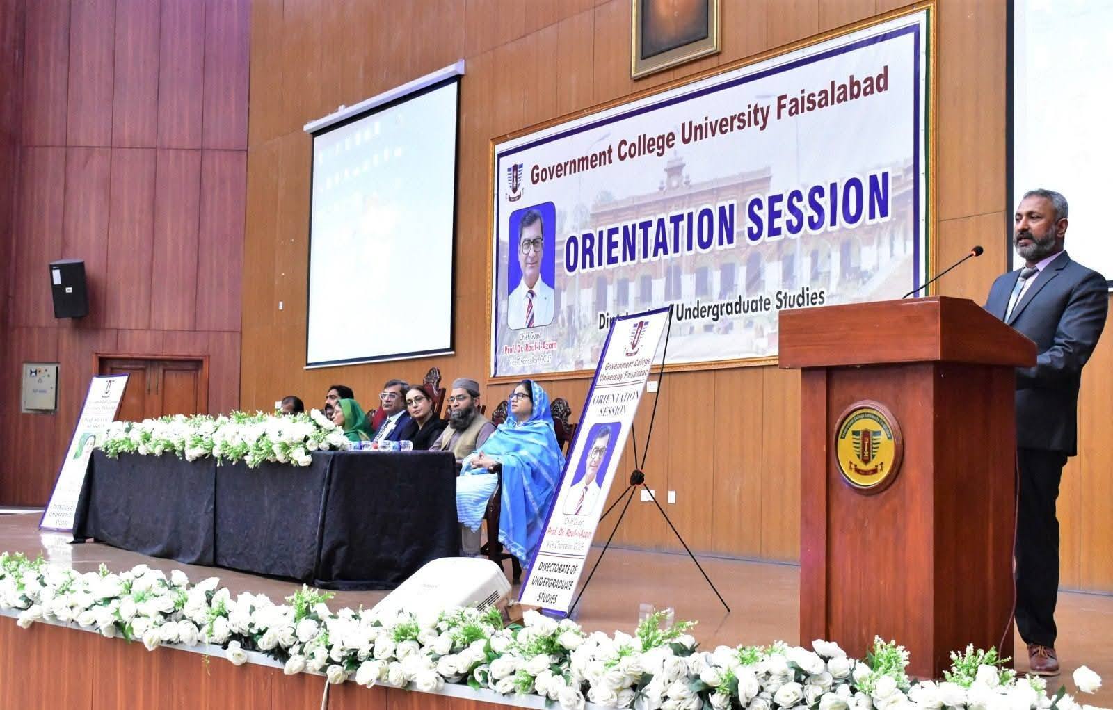 Government College University Faisalabad organized a grand orientation session for newly admitted students of BS programs at the Quaid-e-Azam Auditorium, New Campus. The event aimed to familiarize new entrants with the university’s academic environment, rules and regulations, facilities, and departmental structure.