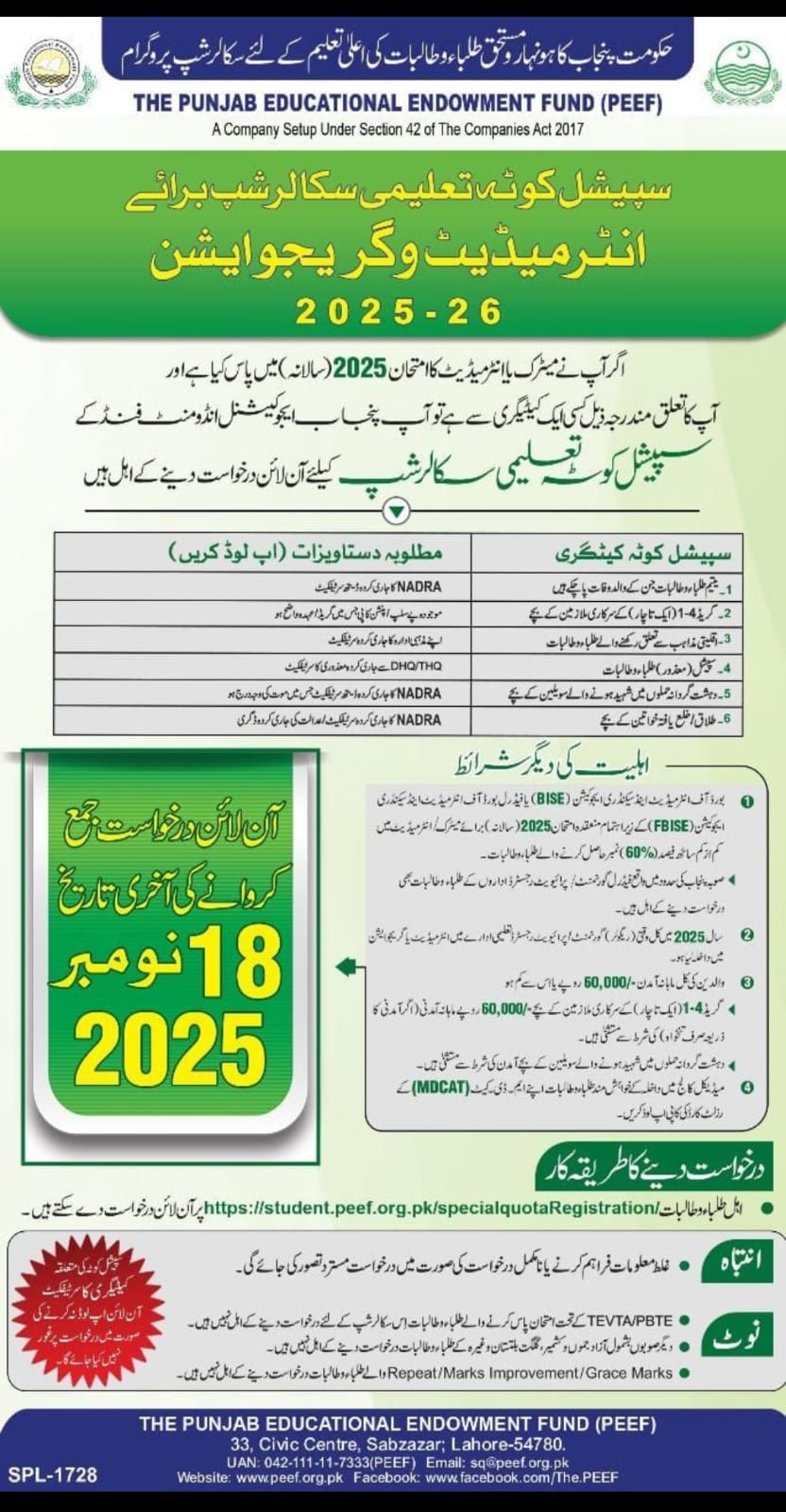 Special Quota Educational Scholarships for Intermediate and Graduation 2025–26