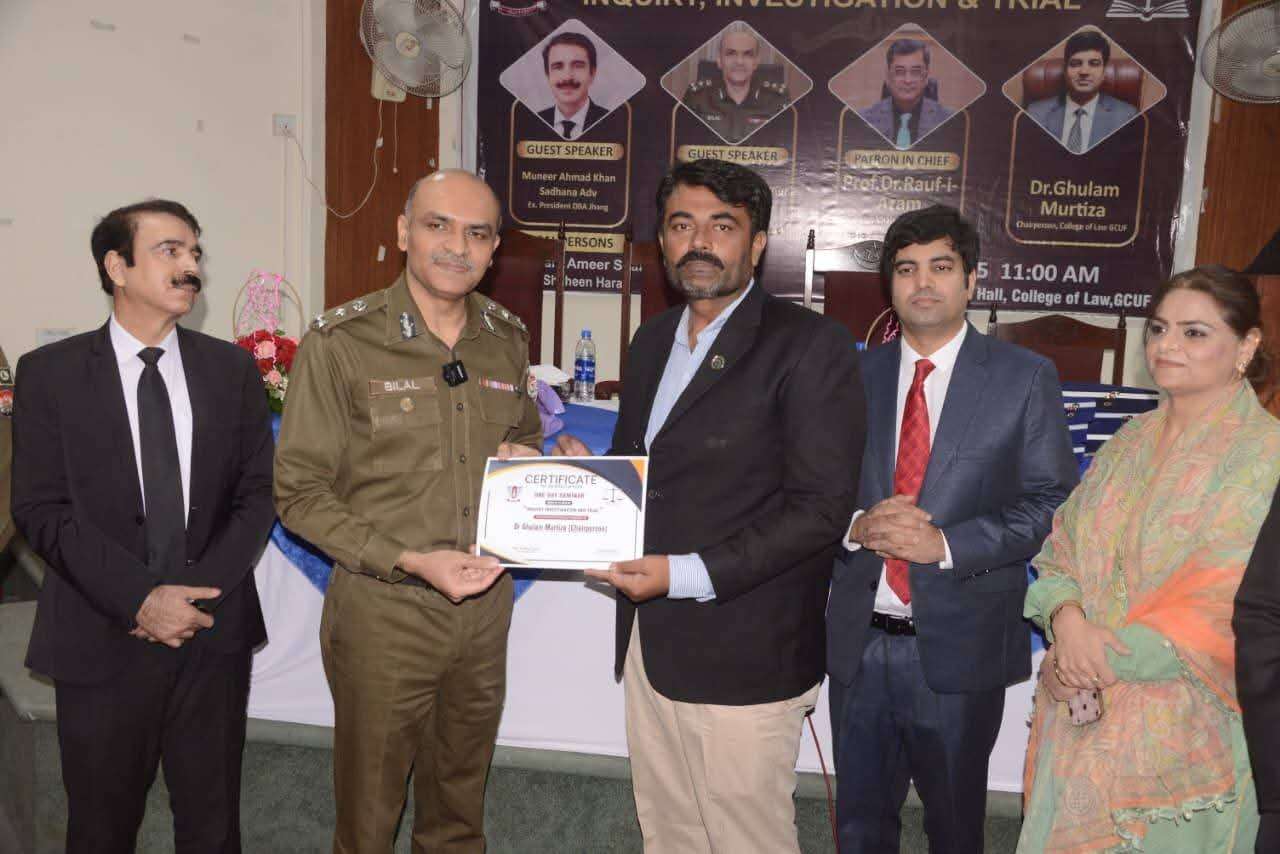 The College of Law, Government College University Faisalabad, organized a one-day seminar on “Inquiry, Investigation, and Trial” at Ahmad Faiz Hall, Yousaf Block, Old Campus, on Tuesday. The event aimed to bridge the gap between theoretical knowledge and practical understanding of Pakistan’s criminal justice system.