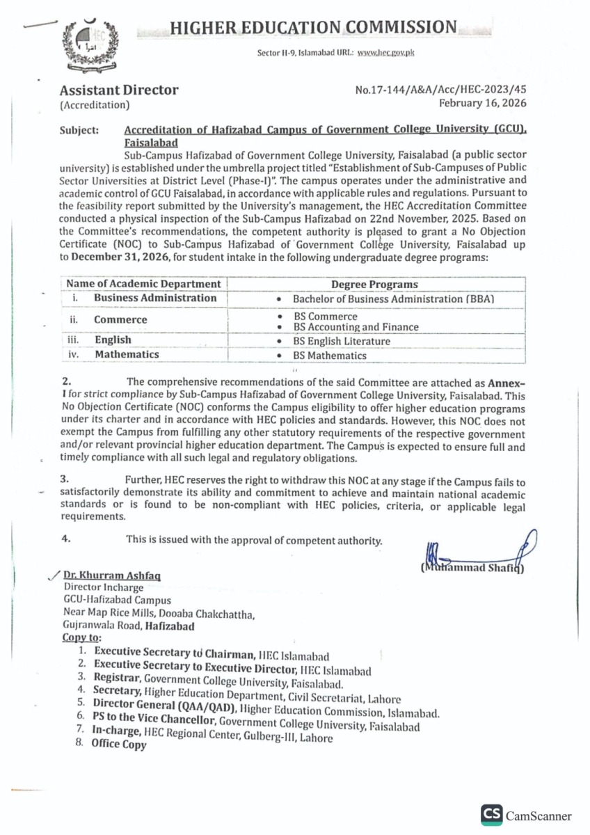 Government College University Faisalabad (Hafizabad Campus) has proudly achieved a significant milestone today by securing official accreditation from the Higher Education Commission (HEC).